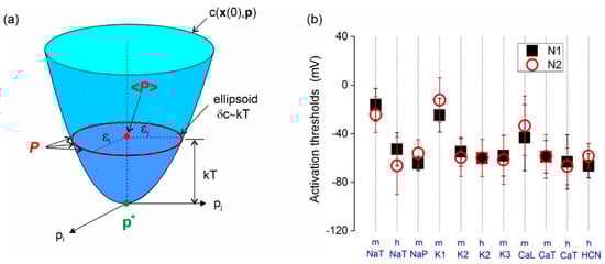 (a) Schematic of the cost function near the global minimum. The parameters () estimated from different parameter guesses distribute on the ellipsoid surface . This ellipsoid effectively broadens the global minimum proportionally to the error variance. Actual parameters are approached by averaging over all initial guesses, since . (b) Activation thresholds (m) and inactivation thresholds (h) obtained by averaging over 84 values of random vector . The average thresholds are shown for two interneurons, N1 and N2, of the songbird high vocal center. The ion channels are transient sodium (NaT), persistent sodium (NaP), potassium (K1), inactivating potassium (K3), muscarinic (K3), high threshold calcium (CaL), low threshold calcium (CaT), and hyperpolarization activated channel (HCN) [8].