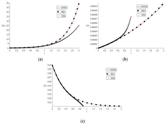 We take a scenario of Attaullah et al. [29], where the initial conditions are , with parameter values . All our calculations as well as our graphs are carried out by Maple 2020. The Maple built-in programme has been used for RK4 solutions with step size . The new iterative method (NIM) and modified new iterative method’s (MNIM) simulation results are illustrated graphically and numerically. We displayed the graphical outcomes of both NIM and MNIM strategies related to the RK4 method in Figure 1. The figure depicts that the 5-iterations of NIM solutions fail to provide suitable accuracy as time increases and solutions are only valid till , whereas the 2-iterations of modified NIM precisions agree well with those of RK4 precisions. Additionally, we contrasted the absolute errors of the proposed MNIM scheme to those of other conventional methods, such as cGP(2) and LWCM [29], GA-IPA and GA-ASA [28], LADM-Padé [21], MVIM [26], HPM [25], Bessel collocation [23] and NIM relative to RK4 method, as shown in Table 2, Table 3 and Table 4 for , respectively. The recent results via cGP(2) and LWCM [29] match to at least four decimal places with RK4. Further, the numeric solutions via NIM matched at least one decimal place with RK4. In contrast, the results show that the solutions by 2-iterations of MNIM match with those of RK4 at least eight decimal places. The comparisons with other methods used for the model clearly indicate that the MNIM scheme outperformed all the pre-existing solutions. Therefore, it suggests the high accuracy and validity of the proposed MNIM scheme with fewer iterative steps.