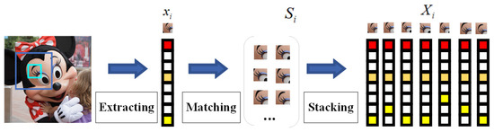 For an input degraded image , the image group , , is constructed based on the multi-color channel image, where , and denote the corresponding image channels. The construction of each channel image group is the same as that of in Section 2.2. Given a RGB image, in each channel, similar patches of the repairing patch with the size of are found in the training window with the size of . , , and denote the image groups corresponding to the , and channels, respectively. The three image groups form the total image group as Formula (9).