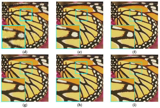 In order to further demonstrate the effectiveness of the proposed multi-color-channels-based GSR model, Figure 3 and Figure 4 respectively show the visual butterfly and girl restoration results of the proposed model and some state-of-the-art models with an 80% pixel missing rate. As can be seen from Figure 3 and Figure 4, the SALSA model cannot restore sharp edges and fine details. The BPFA model can have better visual effects than the salsa model, but it still has undesirable visual artifacts, such as ringing artifacts in Figure 4d. The GSR, JPG-SR and GSRC-NLP models produce over-smoothing effects. Compared with the model proposed in this paper, the MAR-LOW has a similar visual effect, which is not easy to distinguish with the naked eye. However, according to the experimental results in Table 1, Table 2 and Table 3, the proposed model has better objective evaluation results. In general, the visual effects of Figure 3 and Figure 4 show that the GSR model based on multi-color channels proposed in this paper performs best in image restoration. It not only preserves fine details, but also effectively removes visual artifacts.