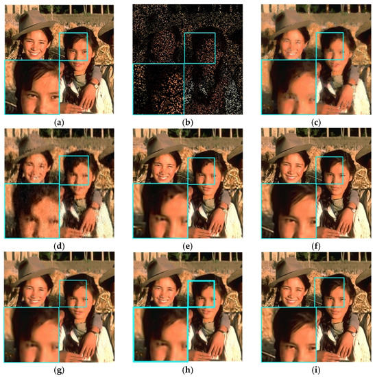 The restoration result of girl with pixel missing rate of 80%. (a) Girl, (b) girl with pixels missing rate 80%, (c) SALSA [38] (PSNR = 23.79), (d) BPFA [4] (PSNR = 22.47), (e) GSR [13] (PSNR = 25.50), (f) MAR-LOW [41] (PSNR = 29.21), (g) JPG-SR [14] (PSNR = 25.55), (h) GSRC-NLP [27] (PSNR = 26.02), (i) our model (PSNR = 29.28).
