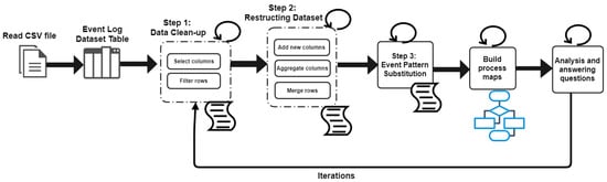 After preprocessing the event logs by using the CPA-PM method, the resulting dataset was imported to two PM tools, namely Disco and ProM, for process discovery (the specific type of process mining of interest in this case study) and analysis. The preprocessing steps can go through several iterations before getting to the final answers to the analysis questions. Even after importing the dataset to PM tools, a process model is generated (e.g.,