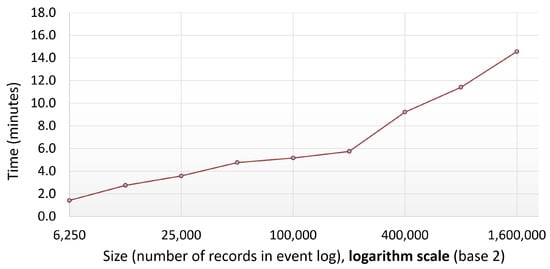 As the number of records in event logs increases, the resulting process maps often become more complex. More preprocessing iterations and effort are hence usually required. It is important to test the scalability of the CPA-PM method and scripts when the size of event logs increases. A scalability analysis was performed on subsets of real datasets that vary in size (by doubling the initial one 9 times). The same script with the same API function invocations was run on each of the datasets. The script was run three times on each dataset, and the average execution times are reported in