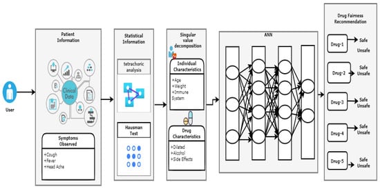 The fair drug recommendation system takes into account health conditions, preferences, race, and gender. Based on the weighted binary singular value decomposition, a stacked ANN is proposed. Figure 1 illustrates the framework for the proposed drug recommendation system. A normal health condition or a worsened state is indicated by the input parameter values. For the recommendation algorithm, the current state of a parameter is crucial. Each parameter value can belong to a different class according to the proposed technique. Every user has a unique health profile, which is compared to a user who had a similar health condition in the past. Based on the user’s immune system and preferences, the stacked ANN model identifies the appropriate set of medications. Our recommendations were based on a comparison of the individuals’ health profiles and individual preferences with those of similar individuals. In Algorithm 1, all the individuals with the same features are grouped into a recommendation cluster.