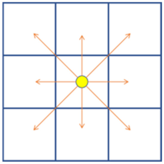 The JPS algorithm is a pathfinding algorithm that uses pruned neighbor rules as the search direction of nodes and the position of forced neighbors as the judgment of jump points. The JPS algorithm extends the jump points by iterative computation and by selecting the least costly node among the candidate jump points as the subsequent path. The JPS algorithm’s method of determining the current jump point x consists of the following three parts: