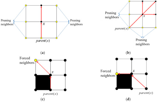 - If the search direction from the parent node of node to is diagonal and there is a point in the horizontal or vertical direction of that satisfies condition 1 and 2, then is a jump point.
