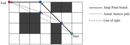 As shown in Figure 3, the JPS algorithm differs from the A* algorithm in the way it selects successor nodes, and the jump search method can avoid the calculation of a large number of redundant nodes in the A* algorithm. The JPS algorithm is undoubtedly an excellent path planning algorithm. However, because the search direction of the JPS algorithm is fixed in the pathfinding process, this will cause the JPS algorithm to miss some important path turning points in the search process, resulting in the JPS algorithm’s result path and the shortest realistic path still exists. A common optimization method is the LOS optimization method. The LOS optimization method can only eliminate the redundant points on the path in some cases, while it cannot obtain the judgment due to the existence of obstacles between two nodes, as shown in Figure 4.