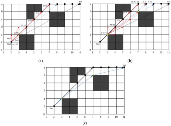 - If the current search point is found to have LOS reachable with the end of the path by detection, the search is ended, as shown in Figure 8 (3). The final generated path is (f,2), (e,3), (b,7), and (a,11).