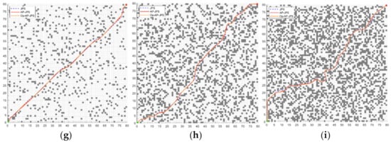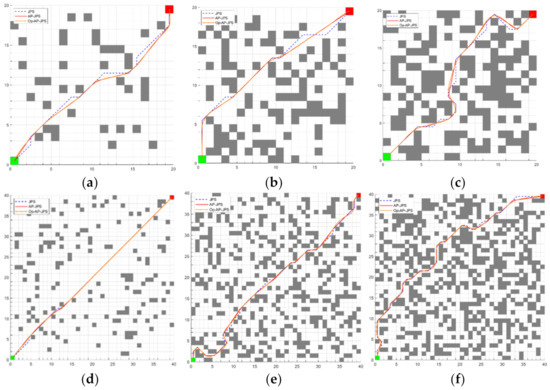 The first set of experiments was conducted using 10 sets of grid maps ranging from 10 × 10 to 100 × 100, with each set of map obstacles set from 10% to 55%, respectively, for the JPS algorithm, the AP-JPS algorithm, and the polynomially optimized AP-JPS algorithm for 100 sets of randomness experiments. To better distinguish the resultant path from the obstacle grid, this experiment places the starting point of the path planning at the middle point of the grid. The distance calculation in the heuristic function of the JPS algorithm and AP-JPS algorithm in the simulation uses the Euclidean distance formula, and the actual results are the average of 10 experiments. In this paper, the polynomially optimized AP-JPS algorithm is referred to as Op-AP-JPS to facilitate the presentation of experimental results. The results of the simulation experiment were selected from 20 × 20, 40 × 40 and 80 × 80 size raster maps, and the obstacles were selected from 10%, 30% and 50% for display.