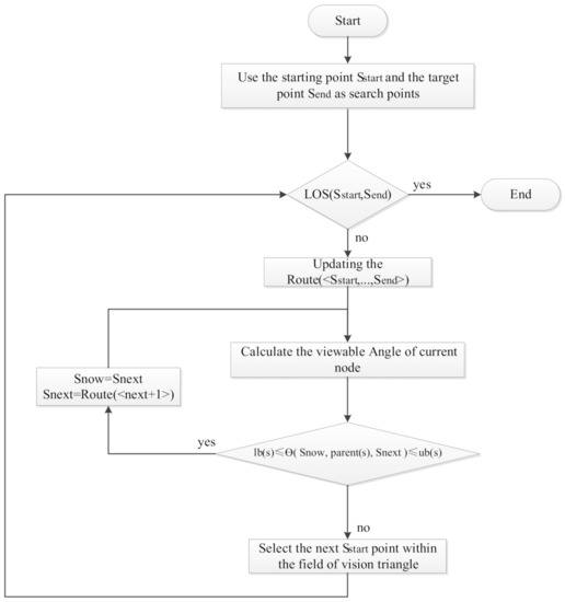 After the angle constraint is completed, the LOS reachability of and can be determined by checking whether is satisfied when expanding from the current node to the neighboring node . The pseudo code for visual angle constraint is shown below.