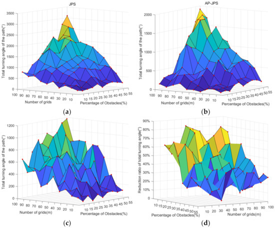 As can be seen in Figure 9, the JPS algorithm searches in a fixed number of eight directions during the path search. If the JPS algorithm encounters an obstacle during the search process, it will reselect the path according to other fixed directions, resulting in a large path turning angle and long search path edges, thus making it difficult to approach the actual optimal solution. The AP-JPS algorithm shown in Figure 8 reselects the path nodes by means of optimization in this paper to obtain a shorter path. Meanwhile, the AP-JPS algorithm has better path smoothing after trajectory optimization by minimum snap seventh-order polynomial interpolation. The specific 100 experimental comparisons are shown in Figure 10, where the total turning angle change rate is the reduction rate of the total turning angle of the path of the AP-JPS algorithm compared to the JPS algorithm.