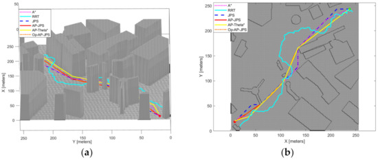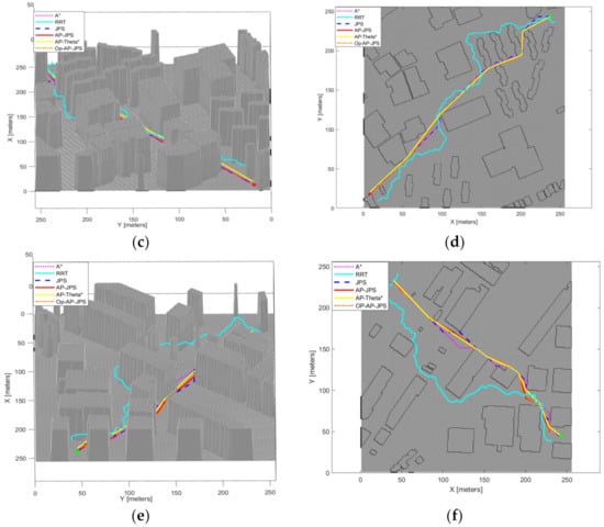 This experiment uses the AP-JPS algorithm, A* algorithm, RRT algorithm, JPS algorithm and AP-Theta* algorithm to conduct comparative experiments in terms of algorithm running time, algorithm memory usage, path length and total path turning angle using maps of downtown Shanghai, downtown New York and downtown Boston extracted from public datasets. The experiments were conducted. The experimental procedure is shown in Figure 13. The comparative results are shown in Table 2.