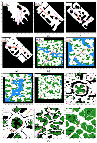 The generated path lengths, total path turning angles, and actual data of the three algorithms were recorded in the twelve sets of experiments as shown in Table 4, Table 5 and Table 6.