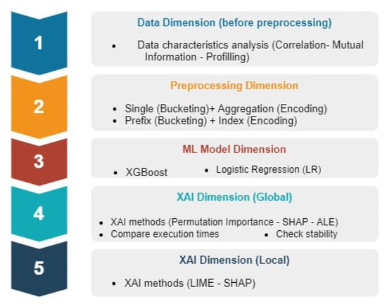 This section describes dimensions of the framework we propose and use to compare basic XAI methods. For the basic infrastructure of a PPM outcome prediction task, we are inspired by the work of Teinemaa et al. [,]. We preserve the settings used in [] to observe their impact given the reported performance of studied predictive models and preprocessing techniques from an explainability perspective.