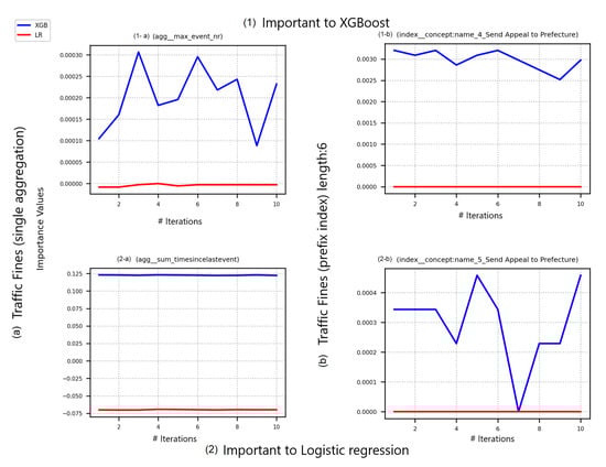 PFI over XGBoost is presenting slightly higher shuffling effects in prefix-indexed event logs than in LR. This effect is slightly changing over shuffling iterations in the same event logs. However, the increase of changes in XGBoost predictions over iterations of shuffled feature values are observed in prefix-indexed event logs to be higher than in single-aggregated ones. Figure 3 shows PFI scores for the Traffic_fines event log, which was preprocessed with single aggregation (Figure 3(1-a),(2-a)) and prefix index (Figure 3(1-b),(2-b)). Figure 3(1-a),(1-b) represent change in prediction errors for both predictive models while changing the top important features to XGBoost. Finally, Figure 3(2-a),(2-b) represent the same for the top two important features to LR.