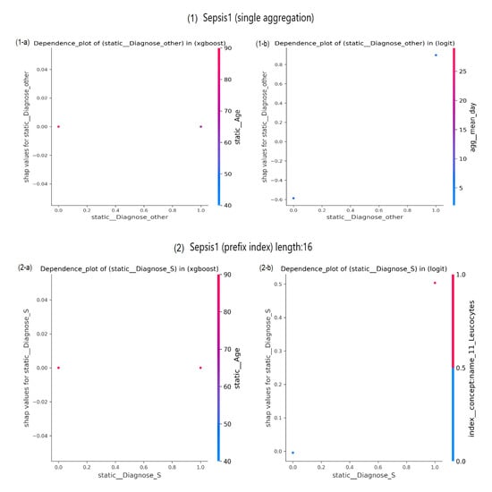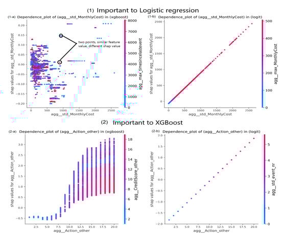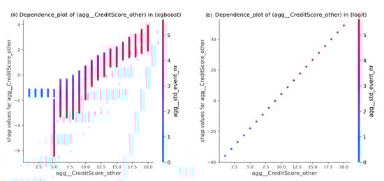 Dependence plots in SHAP represent an illustrative way presenting the effect of low cardinality in some features. These plots offer analyses of the effect of changing a feature’s values on SHAP values while taking the interaction effect of another feature into account. As opposed to PFI, this facility enables us to acquire more information from categorical features. For example, Figure 4 shows SHAP values of a feature CreditScore_other according to both XGBoost and LR predicting outcomes over BPIC2017_Refused event log preprocessed with single aggregation combination. Note that this feature is indicated as the most important one according to LR coefficients and as one of the top five important features based on the XGBoost gain criterion. This feature is a binary feature. However, it has multiple categorical levels due to being encoded based on its frequency of occurrence in a process instance. SHAP values of the feature form a nonlinear curve in XGBoost, and a linear one in LR. In both sub-figures, a point corresponds to a process instance. A point is colored according to its value of an interacting feature, which in this case is std_event_nr. According to LR, shap values increase linearly with increasing CreditScore_other values. The interacting feature values are increasing, as well. However, as a result of having all points of the same CreditScore_other value with identical shap value, it is unclear whether all points of the same CreditScore_other have the same std_event_nr value. In turn according to XGBoost, there is an interaction between both features resulting in having points with the same CreditScore_other value to obtain different shap values. These shap values decrease as the values of std_event_nr increase for points with the same CreditScore_other value.