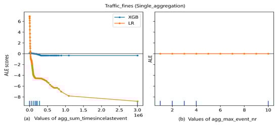 This subsection presents an analysis of PFI, ALE, and SHAP results. We execute two runs of each XAI method to query LR and XGBoost models trained over the event logs preprocessed with single aggregation and prefix index combination. Results are compared to get insights into their stability. Then, we follow the steps in Algorithm 1 to compare how each method highlighted the influence of the most important features (according to each predictive model) on predictions generation.