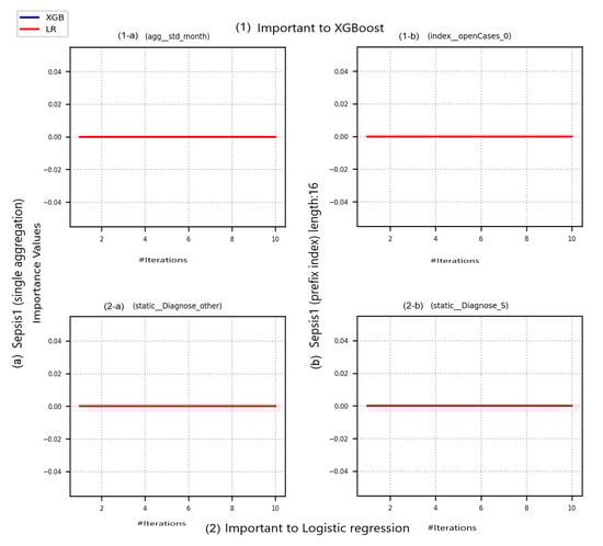 In this work, we include two predictive models, i.e., XGBoost-based and a Logistic regression (LR) that extends the transparency properties of linear regression. In LR, to each predictor, i.e., feature, a weight is assigned. These weights can be used to indicate how the predictive model has utilized relevant features during its reasoning process. XGBoost is an ensemble-based boosting algorithm that has proven to be efficient in the context of several PPM tasks [,]. XGboost is supported by a mechanism to query the model and retrieve a ranked list of important features upon which the model has based its reasoning process.