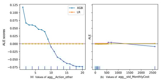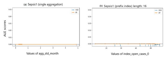 Accumulated Local Effects (ALE). ALE [] calculates the change of the predictions as a result of changing the values of a feature, while taking features interactions into account []. This implies dividing feature values into quantiles [] and calculating the differences in the predictions for feature values with a little shift above and below the feature value within a quantile. The described mechanism complicates calculating ALE effects for categorical features, especially one-hot encoded features. However, recently the common Python implementation of ALE was modified to compute ALE effects for one-hot encoded features using small values around 0 and 1 []. Despite the workaround, computing ALE effects for categorical attributes can be criticised for being inaccurate, as the values of these features do not maintain order [,], i.e., they are nominal features. As another issue, after running ALE over a given event log, effects of each feature are not in a form that yields a rank directly. Therefore, we ranked features based on the entropy of their computed effects.