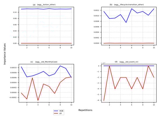 For features with lower number of categories, PFI is unable to capture the effect of shuffling feature values on predictions. The effect of shuffling a feature value is static in predictions generated using LR on most event logs, approaching zero in most cases. However, a slight change across PFI iterations can be observed in event logs preprocessed with single aggregation techniques. This observation indicates an effect of the encoding technique along with the interactions between the features. Shuffling values in PFI aims to break dependencies between the features []. However, with a low cardinality of a feature, the chances of reducing dependencies decreases over a few number of iterations.