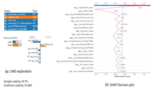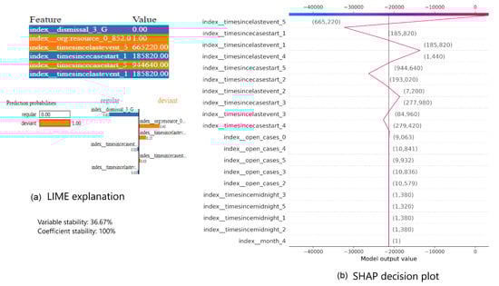 It is supposed that whenever both XAI methods explain the prediction generated by the same predictive model for the same process instance, a similarity between the explanations exists. However, the former observation is valid across all event logs regardless the preprocessing combinations used. If both methods agree on a subset of features, they do not have the same importance ranks. Note that in LIME the goal is to identify a set of features which are important in confirming the current prediction or driving the prediction towards the other class in case of binary classification tasks. In turn in SHAP the purpose is to order features descending based on their SHAP values, i.e., their contributions in driving the current prediction away or towards the base prediction over the whole event log. As example consider the two explanations from Figure 12, which shows the LIME explanation (cf. Figure 12a) and the SHAP decision plot (cf. Figure 12b) of prediction made by LR of the same process instance of Traffic_fines event log preprocessed with prefix index. In Figure 12a, important features are listed in descending order along with their values in the event log based on the coefficients of these features in the approximating model created by LIME. On the bottom of Figure 12a, again these features are listed with the percentage of their contributions. Note that the color code of these features represents whether a feature is driving the prediction towards the currently predicted class or towards the other class. In this case, the currently predicted class is “deviant”.