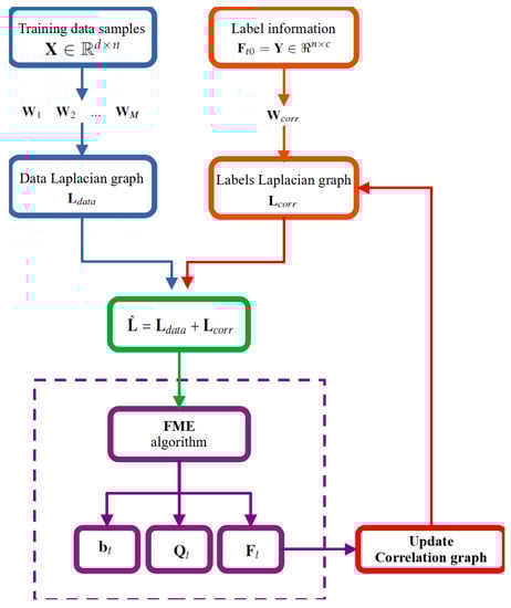 The same goal was achieved by other authors [] by integrating correlations between labels and similarities between instances into a new way of propagating labels. The intuition behind this approach is to dynamically update the similarity measures by merging information from multiple labels and multiple classes, which can be understood in a probabilistic framework. The K-nearest neighbour (KNN) matrix is used to obtain the intrinsic structure of the input data.