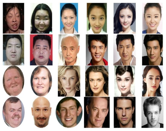 The SCUT-FBP5500 contains 5500 frontal, unobstructed faces between the ages of 15 and 60 with neutral expressions. It can be divided into four racial and gender subgroups, including 2000 Asian females, 2000 Asian males, 750 Caucasian females and 750 Caucasian males. Most of the SCUT-FBP5500 images were collected from the Internet. All images were labelled with beauty values in the range of [1, 5]. Some examples can be found in Figure 3.