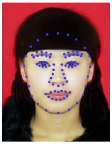 Geometric features have been widely used to quantitatively describe human attraction [,]. The distance of the facial features and the proportions of a beautiful face have the same influence in Asians and Caucasians. The geometric methods used by the predecessors do not consider so much the direct use of facial features as a characteristic to predict a beautiful face. In this work, 81 points of facial contour are used as the geometric feature matrix as Figure 4 shows.