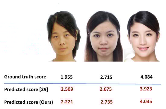 - Fan, Y.Y.; Liu, S.; Li, B.; Guo, Z.; Samal, A.; Wan, J.; Li, S.Z. Label distribution-based facial attractiveness computation by deep residual learning. IEEE Trans. Multimed. 2017, 20, 2196–2208. [Google Scholar] [CrossRef] [Green Version]