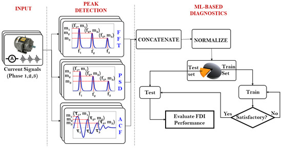 As shown, the model receives current signals from the three phases of the induction motor, which are simultaneously processed via FFT, PSD, and ACF for peak-based feature extraction. The Fourier transform (and its variants) is named after Joseph Fourier (21 March 1768–16 May 1830), and it serves as the foundation for most frequency-domain signal processing techniques. As previously stated, FFT and PSD provide a spectral representation of the constituent periodic components in the current signatures and can be exploited for accurate condition monitoring. In addition, ACF provides the degree of similarity between a discrete signal and its delayed copy as a function of the delay between them.