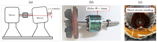 Fault conditions to replicate for the failure modes: (a) rotor misalignment, (b) broken rotor bar, and (c) inter-turn short circuit winding.