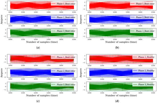 Current data were collected from the three-phases of the motors at the different operating conditions and cleaned. Figure 4 shows a visualization of the current signals collected from the induction motors at the different operating conditions, with red, blue, and green representing phases 1, 2, and 3, respectively.