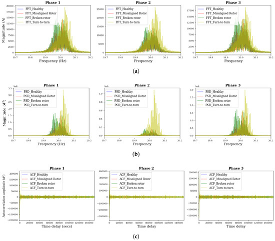As shown, the signals reveal some similarity in waveforms across the different operating conditions apart from the phase 2 signal (in blue) of Figure 4c, whose maximum amplitude is about 2 amperes while the rest have a magnitude of 1 ampere. Next, the signals were processed for feature extraction using the method proposed in Section 4. Figure 5 shows the respective FFT, PSD, and ACF visualizations of the signals under the different operating conditions.