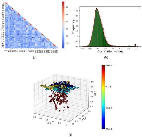 Figure 6a shows the Spearman’s correlation heatmap of the peak features extracted from motor current signals. Overall, the feature set, which formed a 180-dimensional feature matrix, is mostly uncorrelated, with correlation values normally distributed with a mean of zero, as shown in Figure 6b. This hints that the features are not correlated and are, hence, very useful for discriminative modeling. Further assessment of the features using the LLE-based feature visualization tool shows in Figure 6c that the dissimilarity between respective feature clusters per operating condition. They are reasonably isolated in space, as shown in the dark blue, light blue, yellow, and red circles corresponding to the ARM-1, BRB-2, ISC-3, and NOM-4 conditions, respectively.