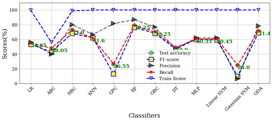 In general terms, accuracy measures a model’s ability to predict classes correctly and is represented in Figure 7 in green circles. F-1 (represented by yellow squares with blue dotted lines) is calculated by taking the average of precision and recall, which determines the proportion of true predictions the model makes among all actual predictions. Precision determines the percentage of classes that are true and is represented by black triangles, while recall determines the percentage of predicted cases that are actually true and is represented by red stars. As observed, RF is the highest performing classifier, with a test accuracy of . This is followed by NBC, QDA, and GBC, whose test accuracies are , , and , respectively. On the downside, GPC and Gaussian SVM were the worst performing, with test accuracies of and , respectively, while the rest of the classifiers ranged between and .