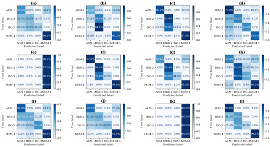 Close examination of Figure 8 reveals that GPC and Gaussian SVM returned the highest false positives (FP) per class (except NOM-4), as shown in Figure 8e,k. However, class-specific efficacy in prediction for RF (see Figure 8f) is observed in its high true positive values (across the diagonal). Unfortunately, the false-alarm rate for ISC-3 is observed in the false negative to BRB-2. This implies that the model mostly recognizes data belonging to ISC-3 as belonging to BRB-2, and this reveals itself as a major limitation of our study.