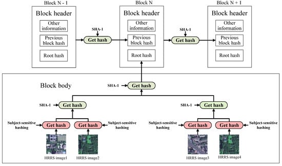 In the block body, the hash sequence of each HRRS image is calculated by subject-sensitive hashing instead of a cryptographic hash. After the subject-sensitive hash sequence of the HRRS image is compressed by SHA-1 (other cryptographic hash functions can also be used), the final hash value obtained is used as the root hash of the block header.