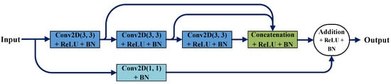 As shown in Figure 2, a series of 3 × 3 convolution kernels are used in the MultiRes block to simulate the receptive fields of 5 × 5 convolution kernels and 7 × 7 convolution kernels. At the same time, the input of these convolution kernels is directly superimposed with the output of these convolution kernels through the residual path after 1 × 1 convolution. This can not only extract image features of different scales but can also reduce the amount of network computation. After all, it is very computationally expensive to directly use 5 × 5 convolution kernels and 7 × 7 convolution kernels to extract multi-scale features.