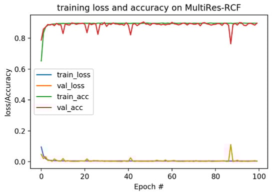 As edge pixels occupy a small proportion in the training samples, an α-balanced variant of focal loss [31] was taken as the activation function of MultiRes-RCF. Due to the limitation of the GPU memory size, the batch size was set to four, and the epochs was set to 100 during the training of the model. As shown in Figure 5, the training loss curve distribution and the validation loss after each epoch are plotted.