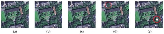 Examples of authentication for HRRS image: (a) Original TIFF format; (b) PNG format (TIFF format to PNG format); (c) watermark embedding (32 bits embedded in single band); (d) Tampering Example 1; (e) Tampering Example 2.