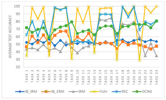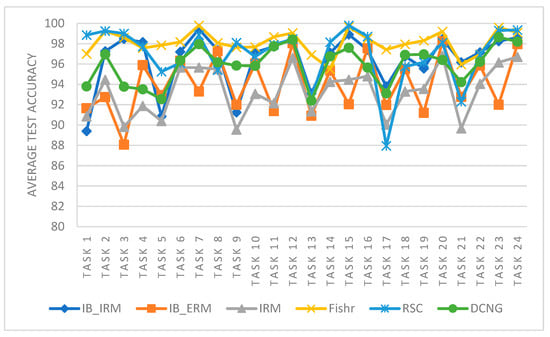 The performance of different generalization methods is analyzed from the perspective of a single task. As shown in Figure 5, the transfer performance of IB_IRM, IB_ERM, and IRM methods is lower than that of Fishr, RSC, and DCNG methods on a single task. For RSC and DCNG methods, the overall transfer result of RSC is higher than that of DCNG. However, in some transfer tasks, such as task 17, the performance of Fishr is lower than that of theDCNG method, and in the overall transfer tasks, the performance of Fishr is better than that of the DCNG model. The specific significance of the tasks is shown in Table 2.