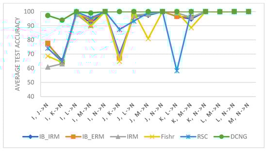 The performance of different generalization methods was analyzed from the perspective of the entire task. IB_IRM, IB_ERM, and IRM methods fluctuated greatly in each transfer task, especially in the odd transfer task. The Fishr method was the most stable and superior for the DCNG model. Although RSC performs better than the DCNG model on some transfer tasks, the results varied greatly between tasks and are not as stable as the DCNG model.