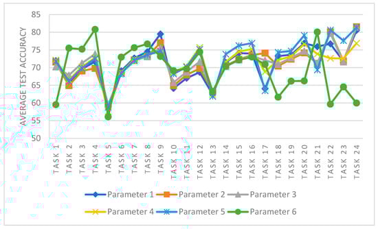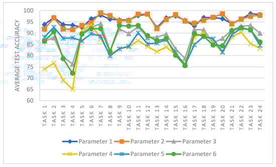 As shown in Figure 9, the performance of DCNG model in the CWRU data set under different parameter settings is shown in Table 5. From the perspective of different tasks, even in the same task, different parameter settings will affect the transfer performance of DCNG model. When values of parameters 1, 2, 5, and 6 increase and values remain constant, the DCNG model’s effect on the transfer task decreases and the larger value increases, which is more obvious on task 1 and task 4. The value of increases and the value of remains constant in the settings of parameter 3 and parameter 4 and the performance of transfer decreases gradually, which is more obvious in the first 15 transfer tasks.