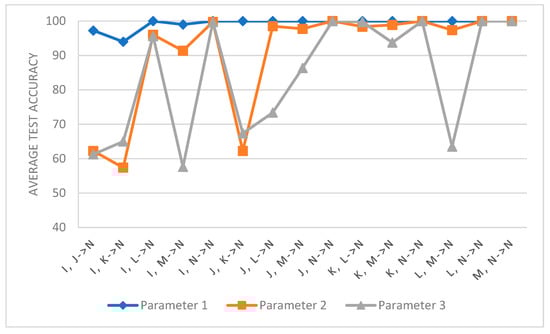 Figure 10 shows the performance of DCNG model under different parameter settings on the MFPT dataset. Since both CWRU and MFPT datasets belong to the scenario where the working condition changes due to a single condition, the influence of parameter ρ is not as great as that of the τ value. Therefore, for the ρ value, we selected the optimal value in the CWRU data set and the specific parameter settings are shown in Table 6. With the increase in τ, the transfer performance on a single transfer task begins to decrease. From I, J -> N and I, K -> N, the transfer results of N and other tasks can still be analyzed, and it can be concluded that the difficulty of transfers will increase with the increase in the “distance” of working conditions and the performance of the transfer task with the large “distance” of working conditions is an important basis to investigate the model’s generalization ability.