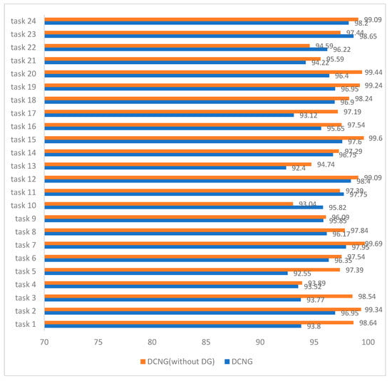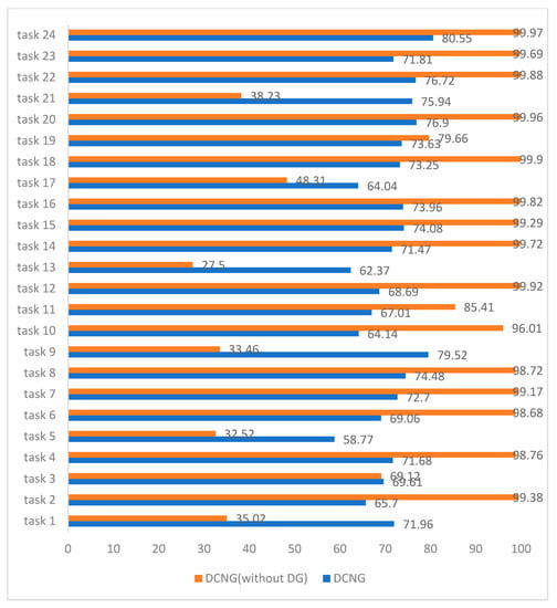 Figure 14 shows the comparison between the results of the generalized model DCNG and the ungeneralized model in 24 transfer tasks of KAT data set. The average result of the ungeneralized model on the overall transfer task was 80.75%, among which the transfer result on task 24 was 99.97%, and the transfer result on task 13 was 27.5%, with a difference of 72.47%. The average transfer result of the generalized model DCNG on the overall transfer task was 71.16%, the highest transfer result on task 24 was 80.55%, and the lowest transfer result on task 5 was 58.77%, with a 21.78% difference between them. Although the effect of the ungeneralized model on some transfer tasks is higher than that of the generalized model DCNG, the effect of the ungeneralized model on different transfer tasks is not balanced, and the maximum gap can reach 72.47%. In a sense, the ungeneralized model is invalid in some transfer tasks.