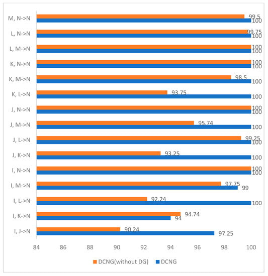 Figure 13 shows the comparison between the results of the generalized model DCNG and the ungeneralized model on 15 transfer tasks with N working conditions as the target domain in the MFPT dataset. The results of the ungeneralized model on the transfer task with N working conditions as the target domain are quite different from those of the DCNG model, so we only compare the results on the migration task with N working conditions as the target domain. The average result of the ungeneralized model on 15 transfer tasks is 96.98%, while the average result of the generalized model on 15 transfer tasks is 99.35%.