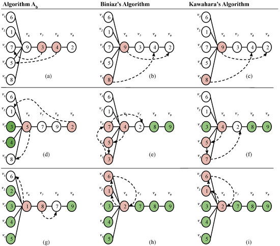 Comparison of algorithm with Biniaz’s and Kawahara’s algorithms. (a) = 3, Swaps = 2; = 4, Swaps = 3. (b) Maximum valued path token () = 9, Swaps = 3; = 8, Swaps = 3. (c) Maximum valued token () = 9, Swaps = 3; = 8, Star tokens = {3}, Swaps = 4. (d) = 5, Swaps = 1; = 2, Swaps = 4. (e) = 7, centered star chain = {4,5,3,7}, Swaps = 4. (f) = 7, Star tokens = {4,5}, Swaps = 3. (g) = 1, Swaps = 1; = 8, Swaps = 1, Total Swaps = 12. (h) = 6, centered star chain = {2,1,6}, Swaps = 2, Total Swaps = 12. (i) = 6, Star tokens = {2,1}, Swaps = 2, Total Swaps = 12.