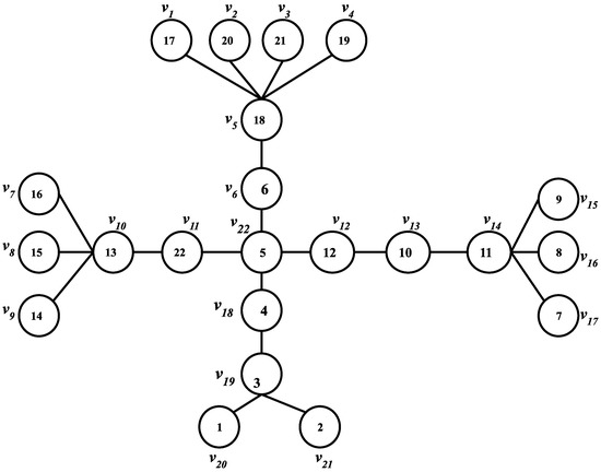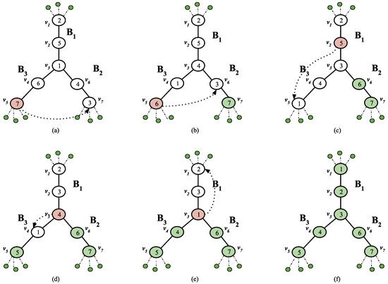 Observe that for Step 2, we are now left only with the path containing path markers. The total moves required on the path to place the markers at their desirable vertices is same as the number of inversions [9,27,28]. Let be the distance from the path marker to its home, where is the path marker residing on the path of the broom. is the total number of swaps executed in Step 2. Then, for the reason stated for in Step 1,