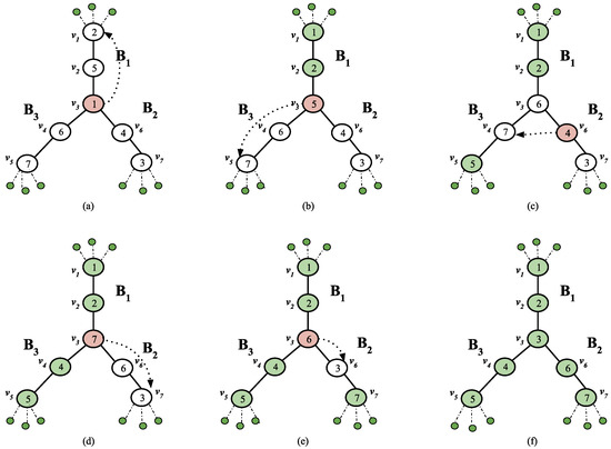 Step 1 of takes a distance-based approach in which is selected on the basis of its distance from the leaf nodes in the star. Step 2 obeys a value-based approach in which a maximum valued path marker is homed first. Biniaz’s, Kawahara’s and Vaughan’s algorithms are strictly based on a value-based approach and work in time. Figure 3 compares the traversal of markers in with the algorithms proposed by Biniaz and Kawahara.