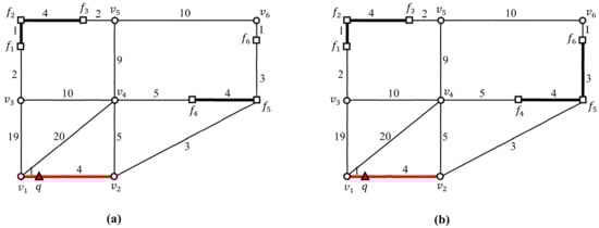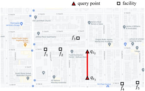 Figure 3 presents an example MkFN query q, where and . This example is used to elaborate the solution process. The example MkFN query requires that the moving query point q constantly retrieves the two facilities farthest from itself. The vertex list in which query point q moves is referred to as the query segment for q. In this example, is the query segment for q (Figure 3). For ease of identification, the query segment is shown in bold.